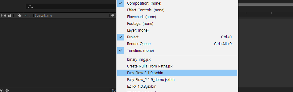 에프터이펙트 상단 메뉴 Window(창) → EasyFlow.버전.jsxbin을 클릭하면 이지플로우가 정상적으로 실행됩니다.